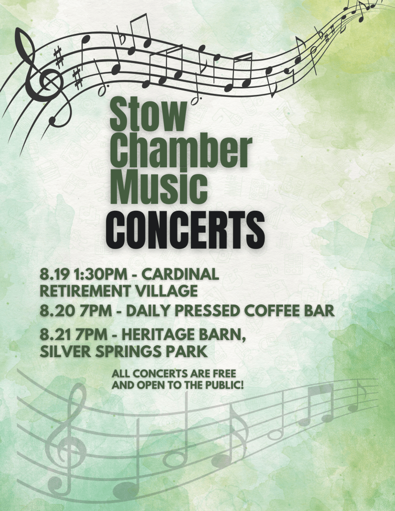 Our mission is to bring world class music to the community of Stow, Ohio and connect with audiences of all ages, backgrounds, and experience levels. We want to challenge preconceptions about classical music, and provide a unique concert experience that everyone can enjoy. Join us for three engaging and exciting chamber music concerts in the community: